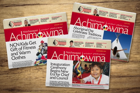 Nisichawayasihk Cree Nation is a culturally rich First Nations community and Achimowina is the publication acting as the nation’s voice. The Cree name Achimowina means ‘stories’ and reflects deep connections with their traditions, beliefs, lands, and people. While Nisichawayasihk means ‘where three rivers meet’ and is symbolized in the wordmark in combination with the all important medicine wheel.